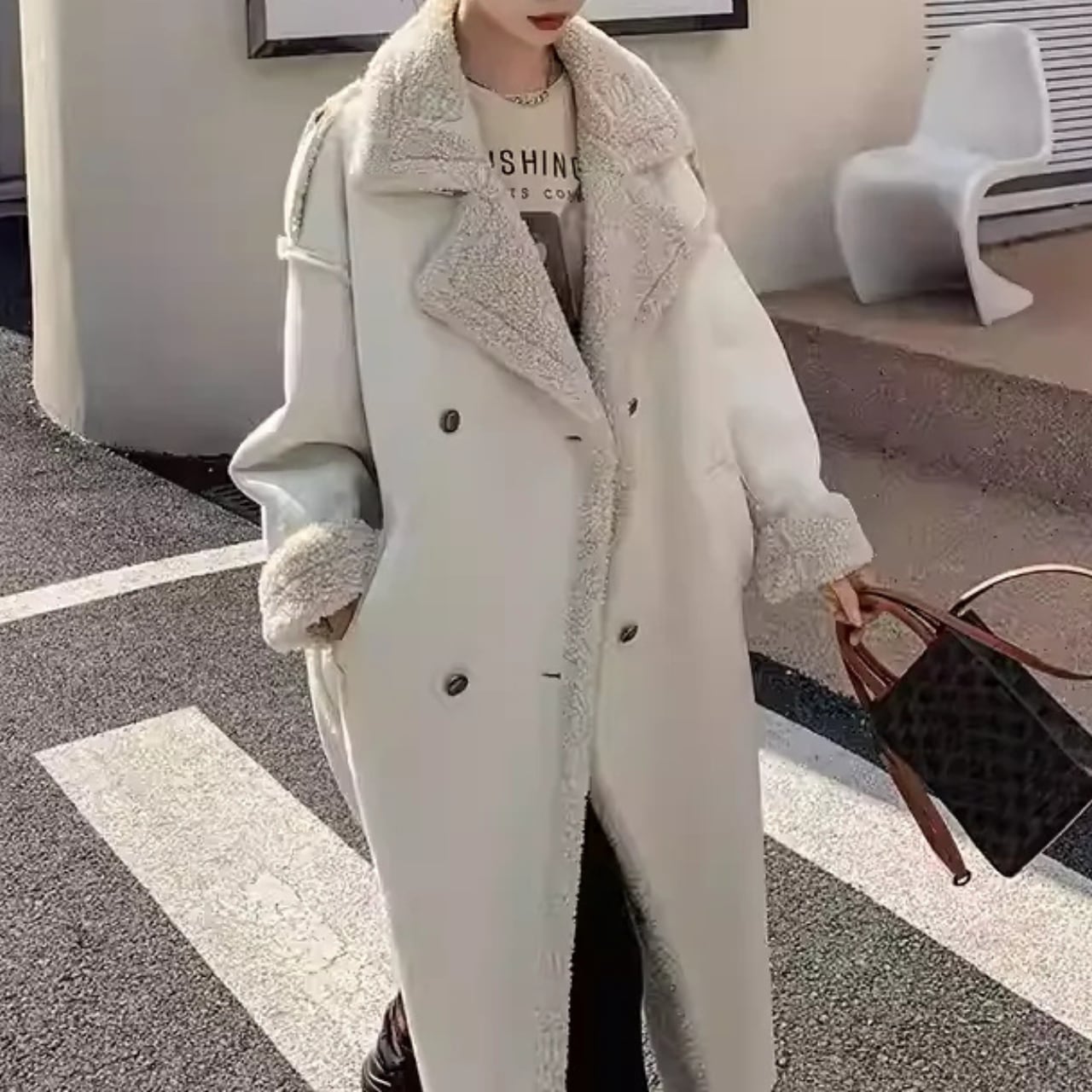 襟元と袖口にあしらったボアがアクセントのロングコート。