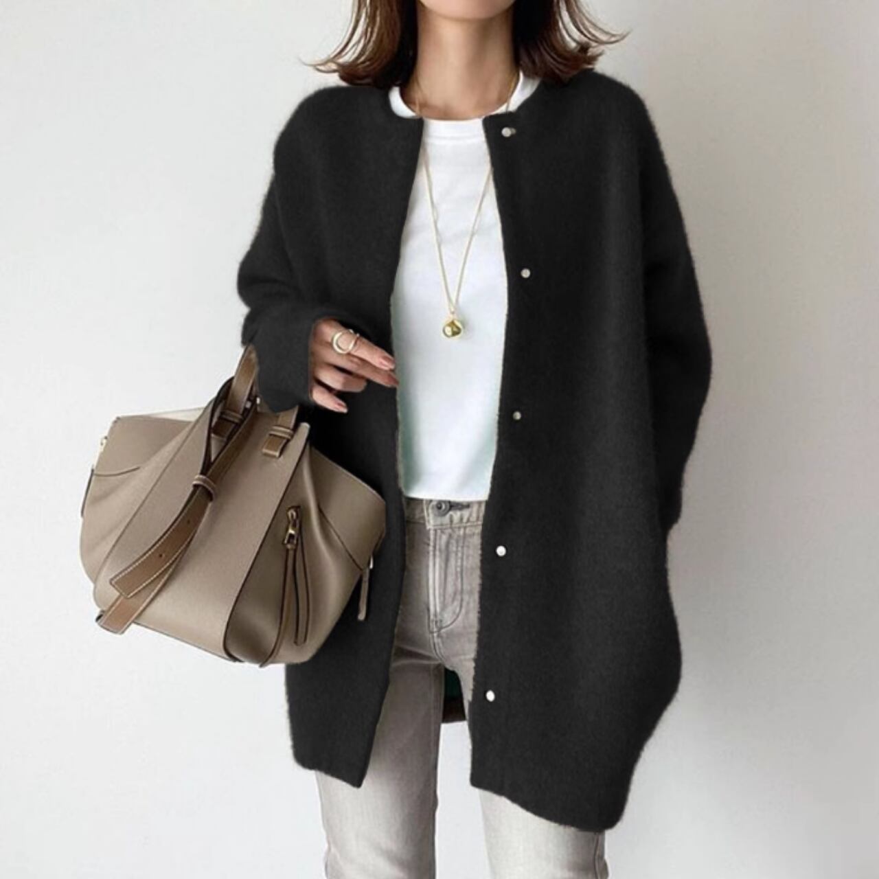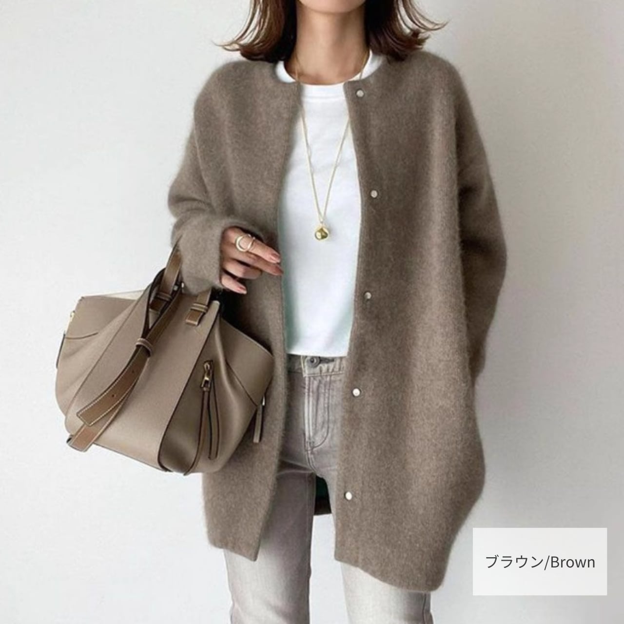 シンプルで上品な、ラウンドネックのミドル丈カーディガンコート。