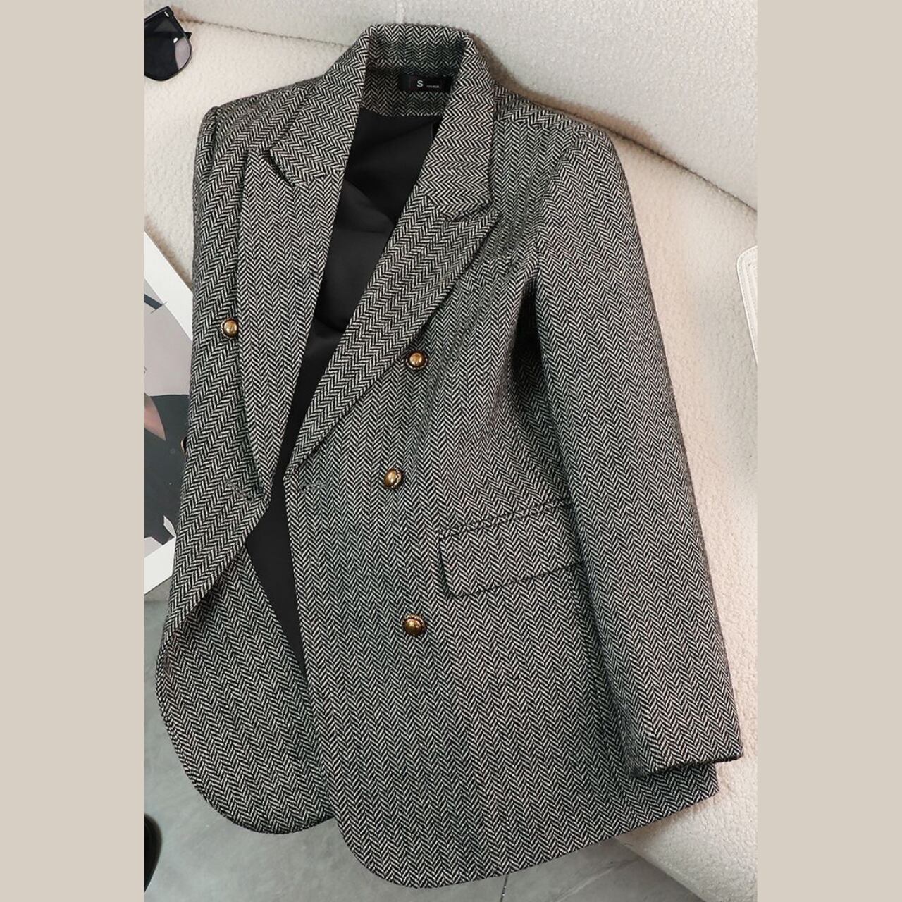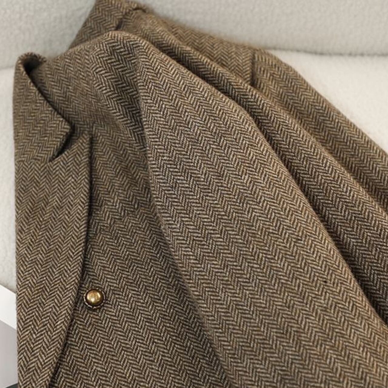 クラシカルなヘリンボーン柄で仕立てた、ダブルブレストのテーラードジャケット。