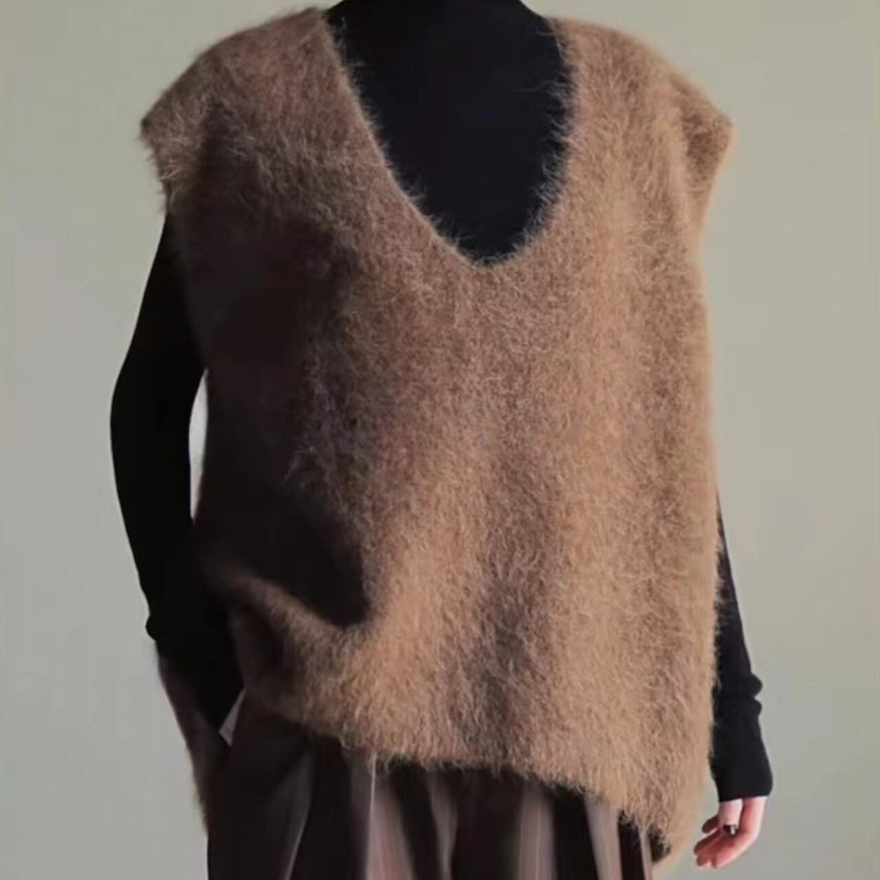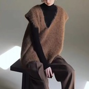 ふんわりとした毛足感と立体的なVネックラインが印象的なニットベスト。