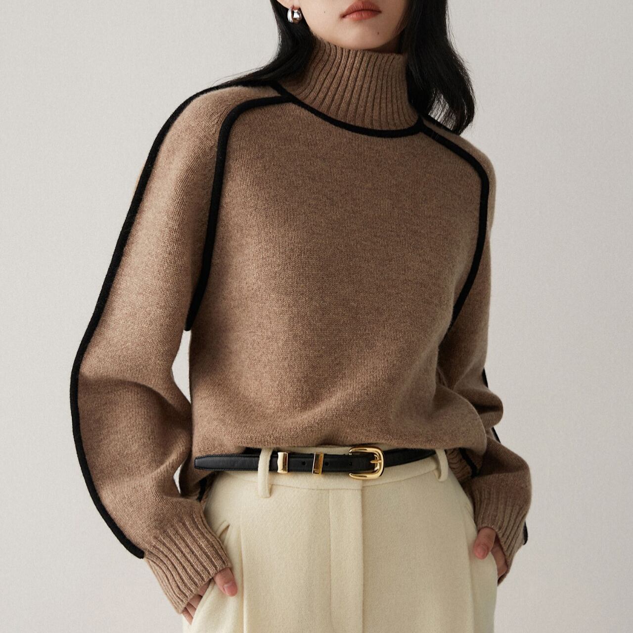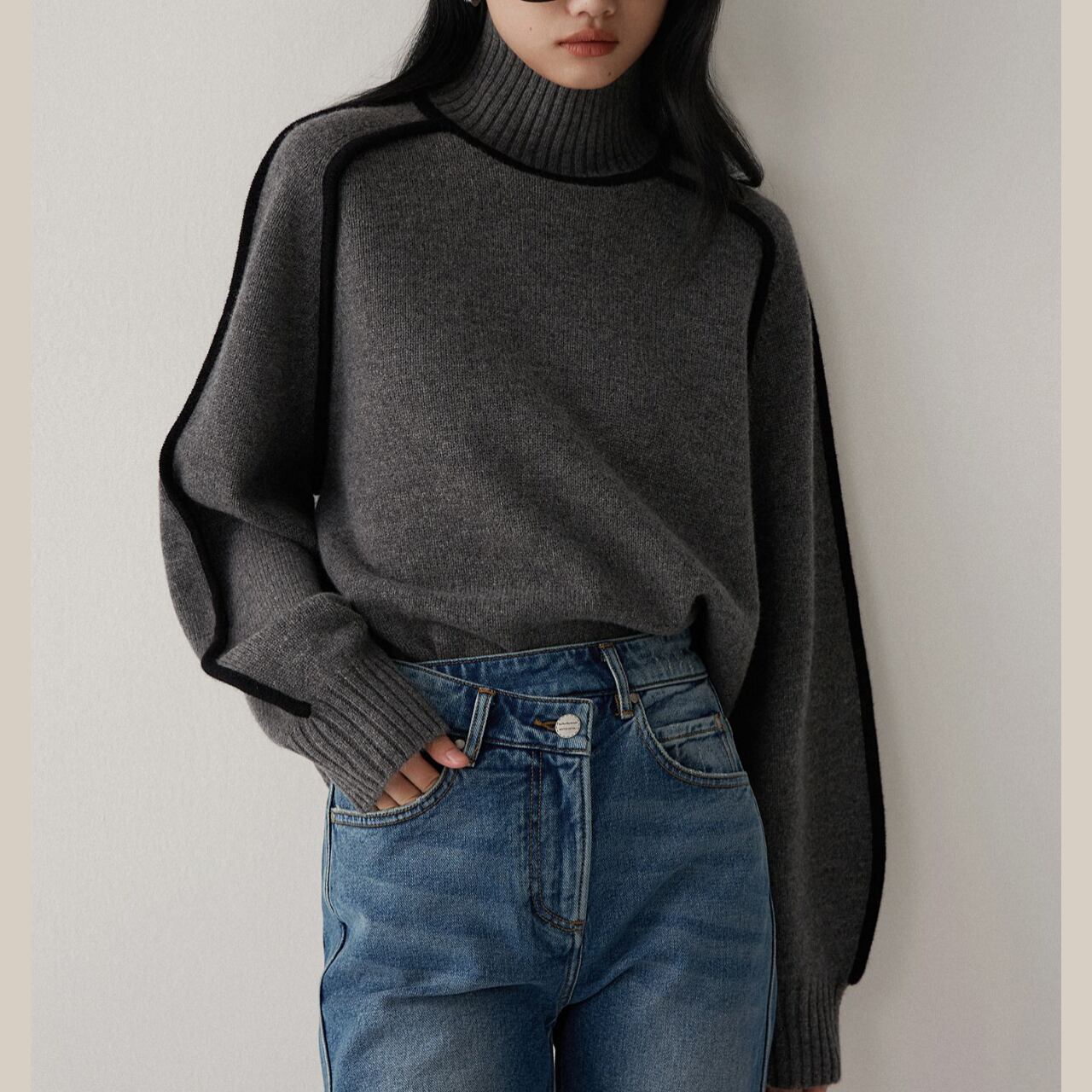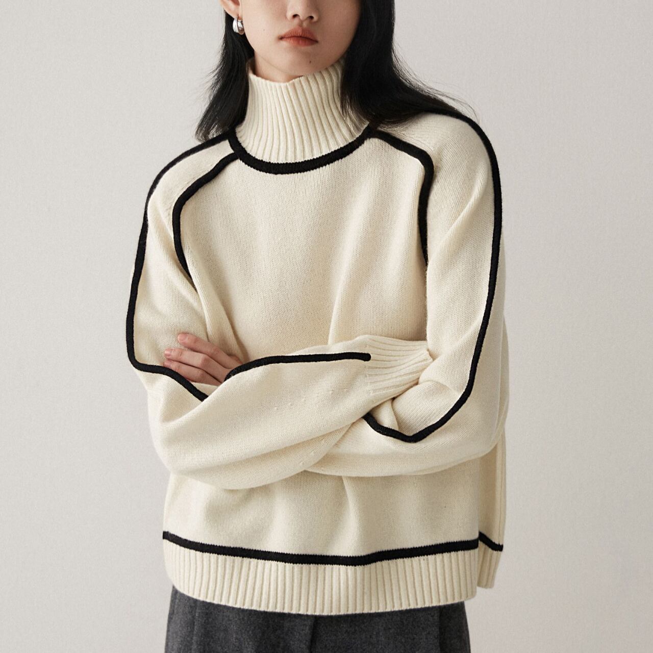 パイピングデザインが目を惹く、タートルネックニット。