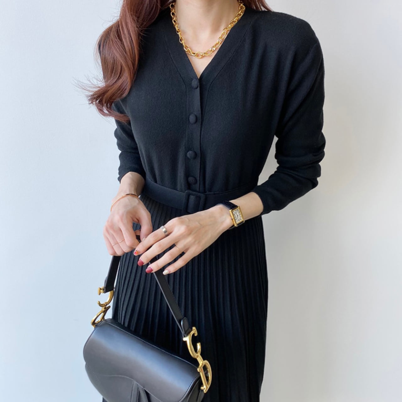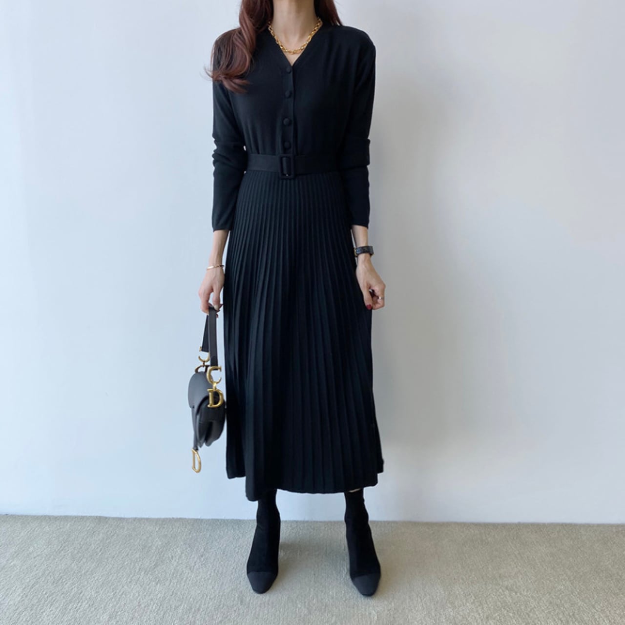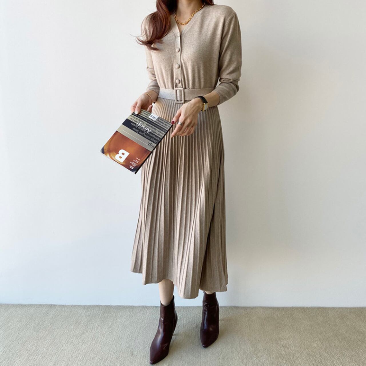 柔らかなニット素材に、繊細なプリーツスカートを組み合わせた上品なワンピース。