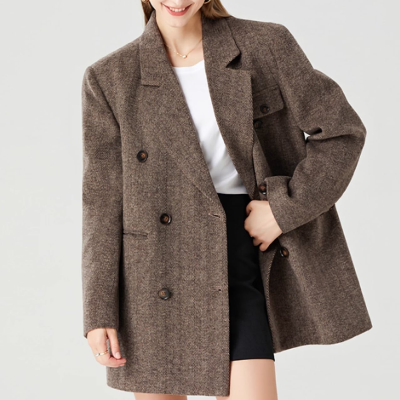 クラシックなヘリンボーン柄が魅力のテーラードジャケット。
