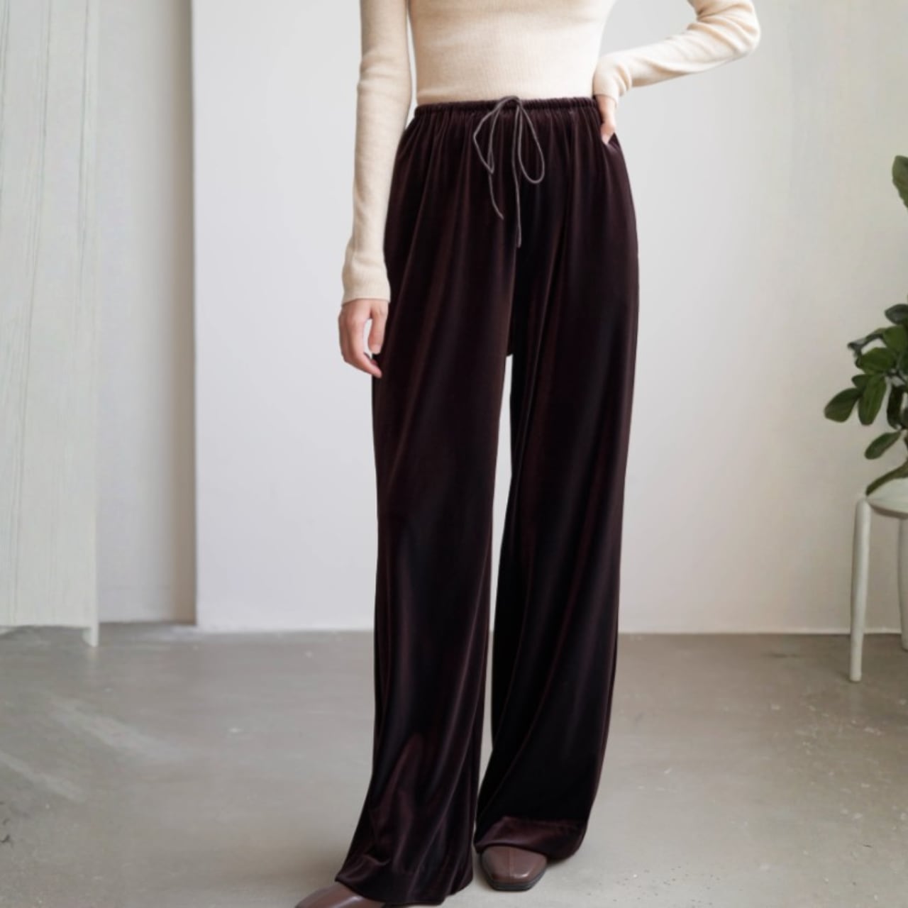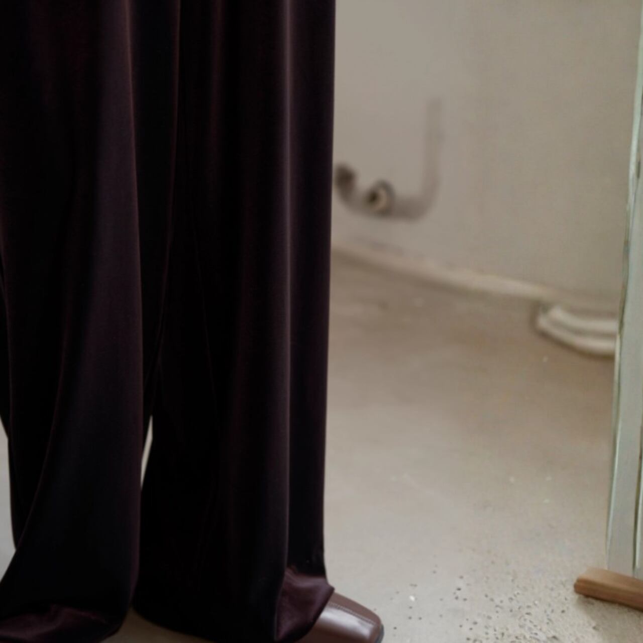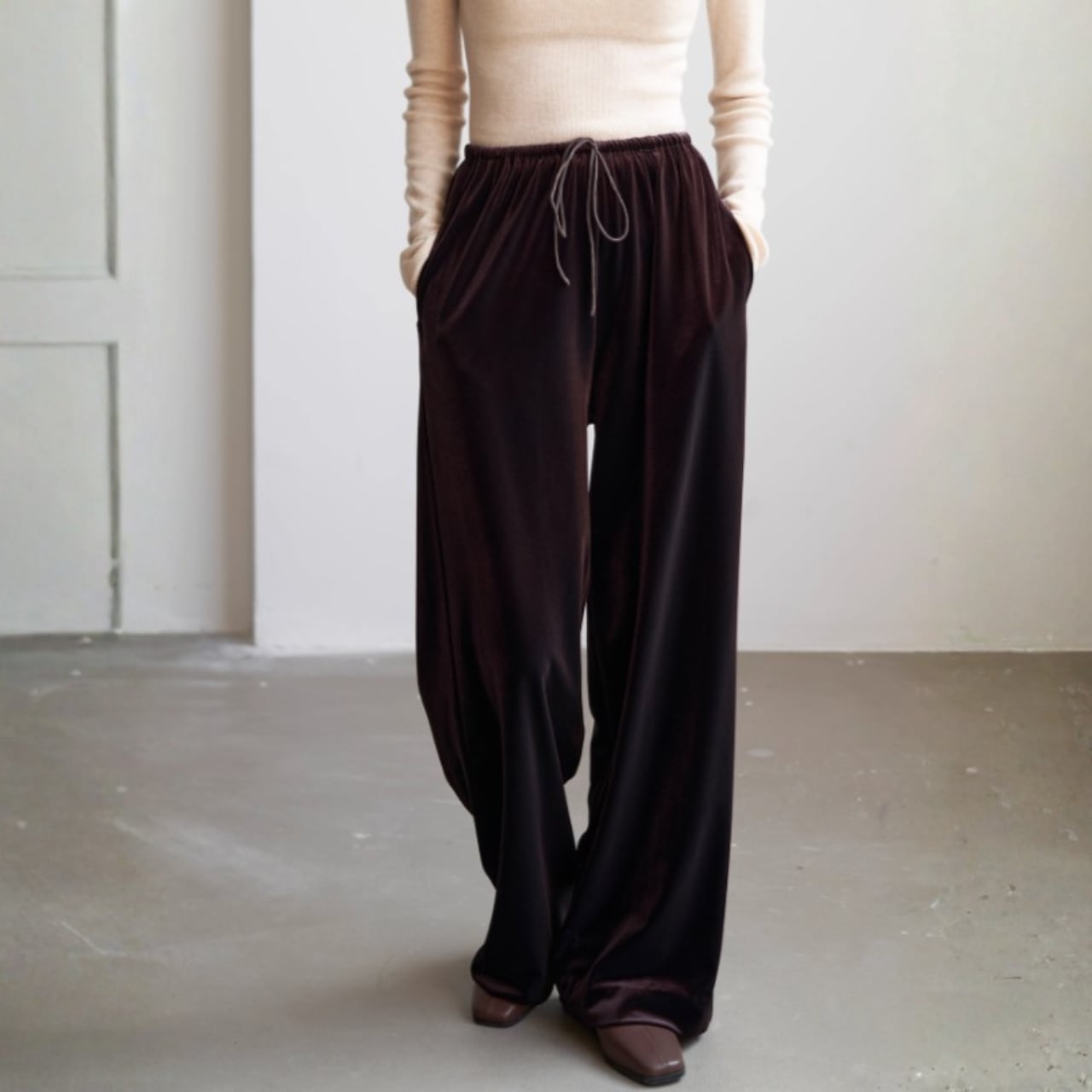 ニットやロングコートとの相性も抜群で、ワードローブに1本あると重宝するベロアパンツです。