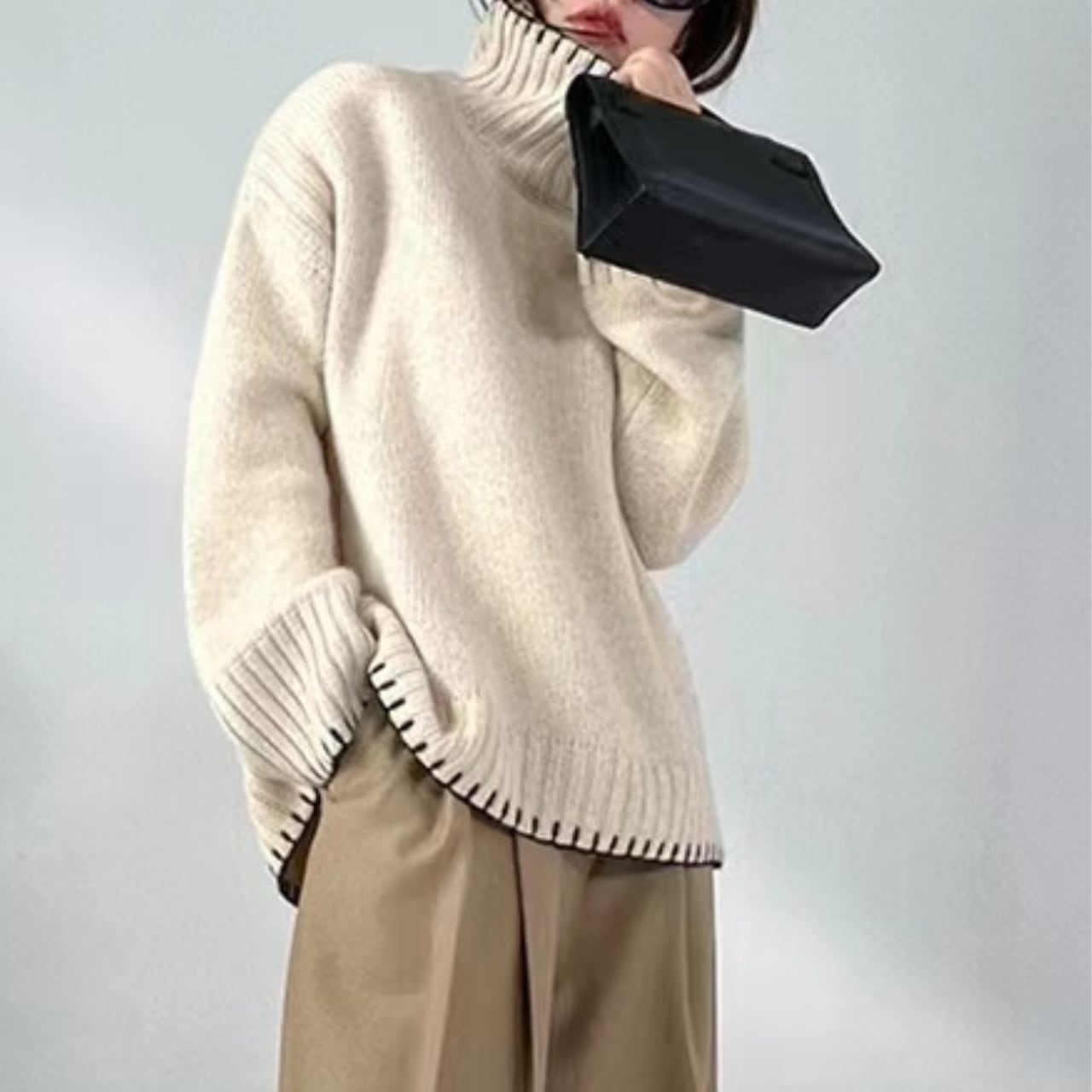 立ち上がる高めのハイネックが顔まわりをすっきり見せ、大人の冬スタイルを上品に仕上げます。
