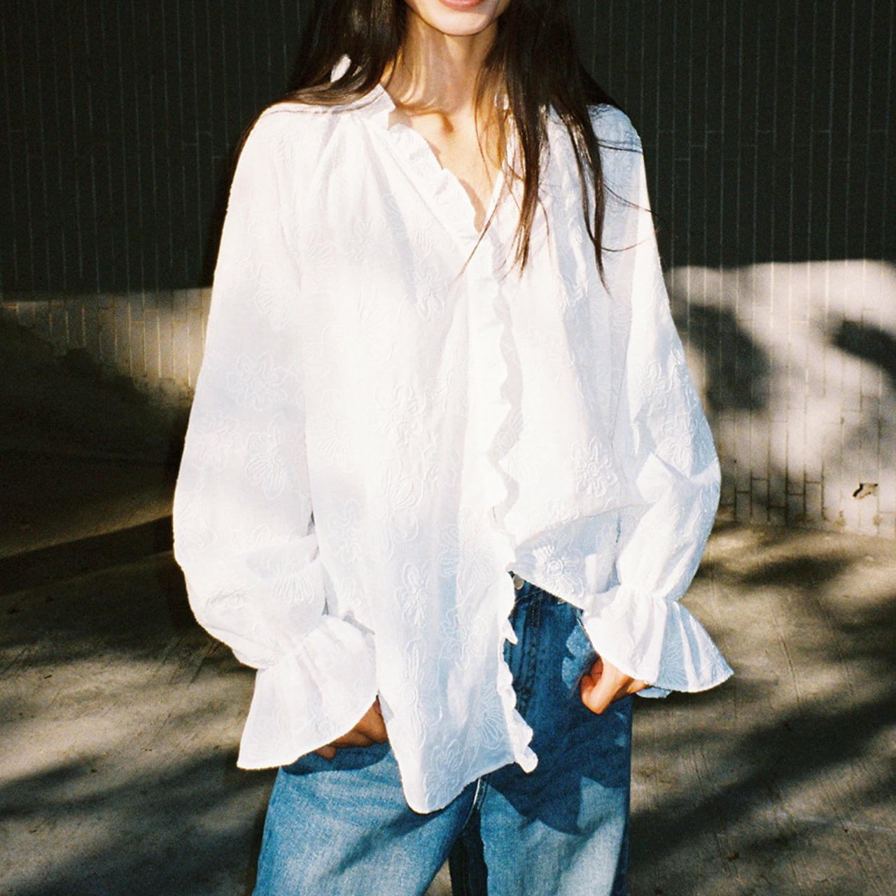 カジュアルにもフェミニンにも着こなせるオープンカラーシャツブラウス。