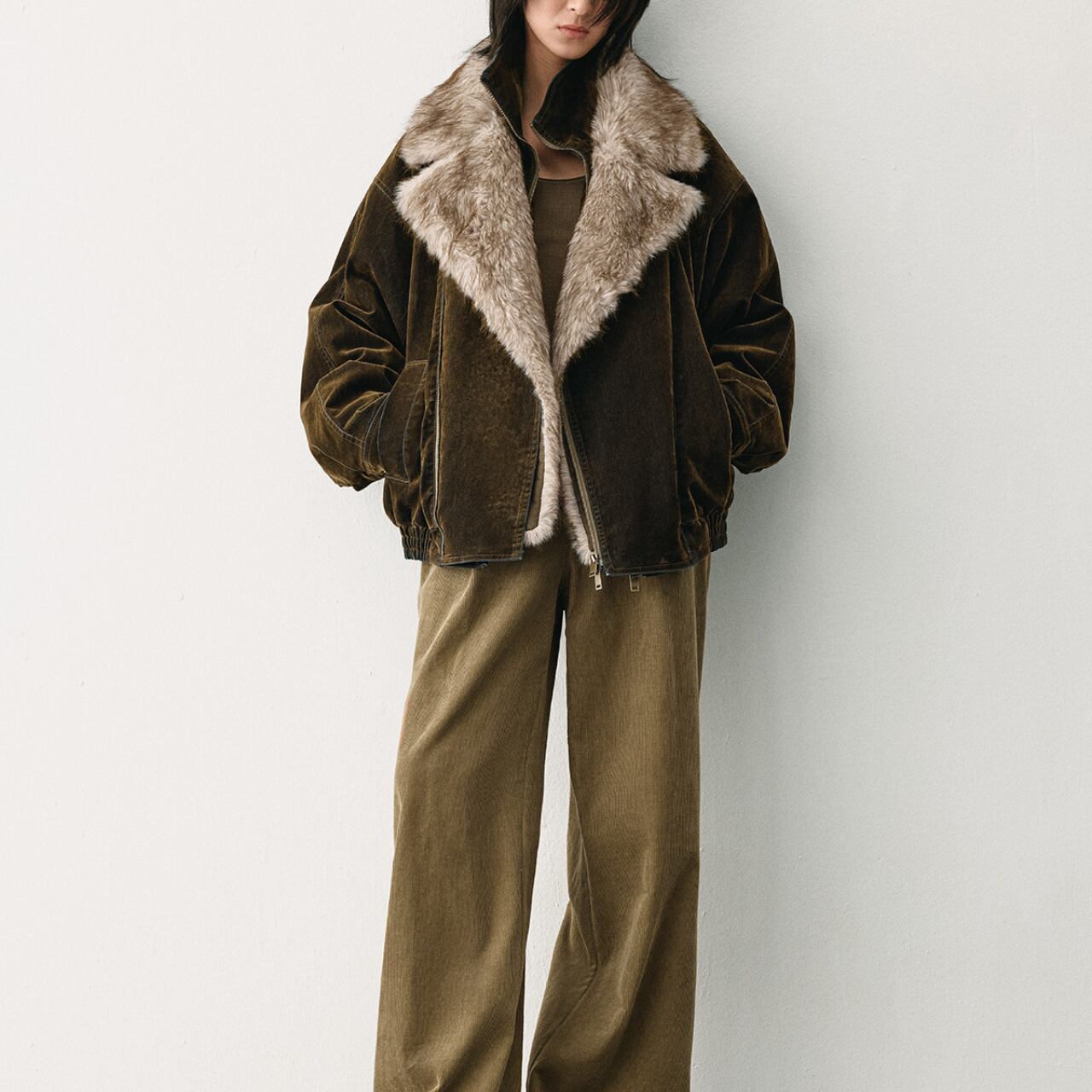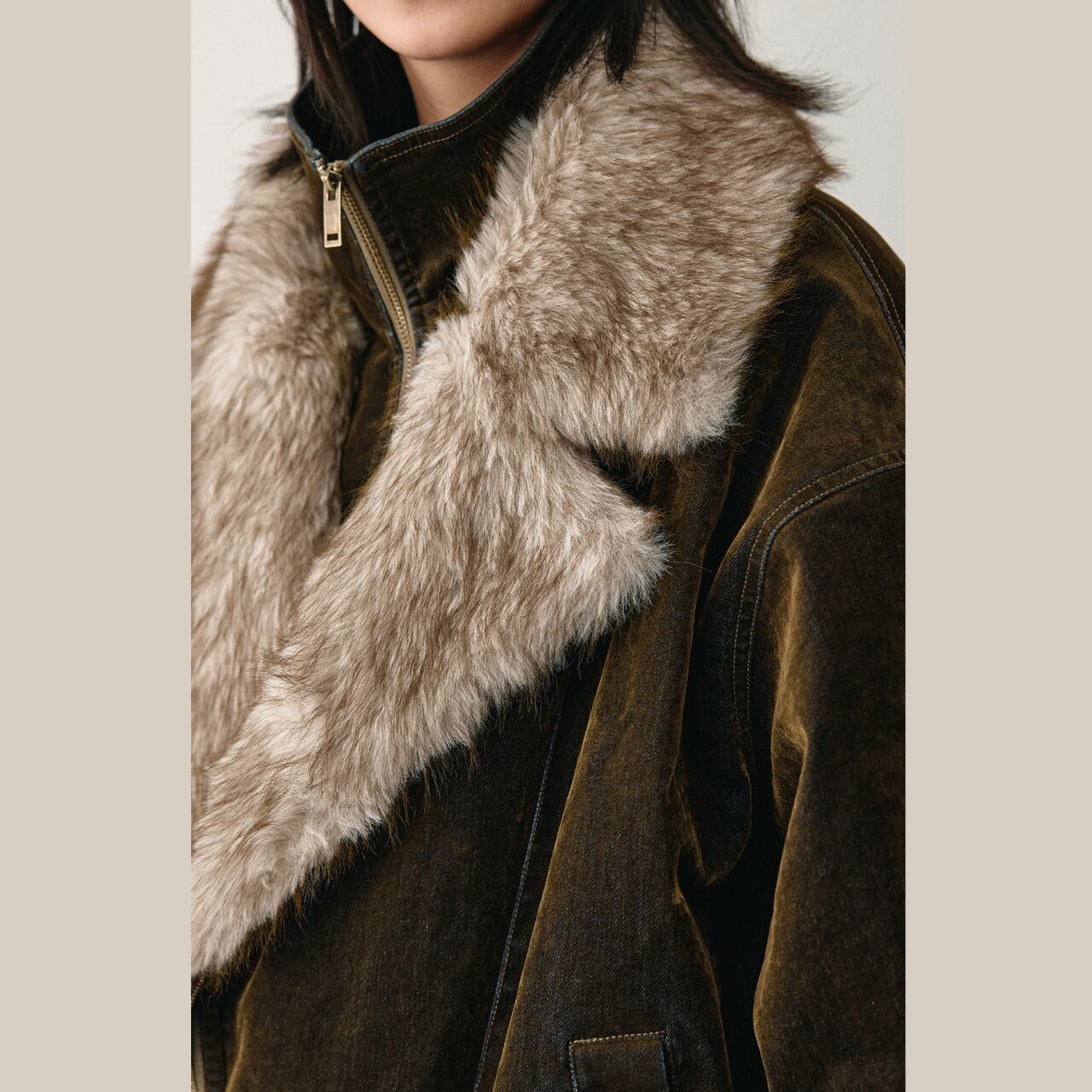首元のファーが顔まわりを華やかに演出し、洗練された雰囲気をプラス。